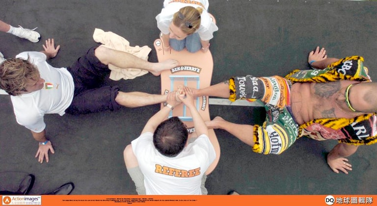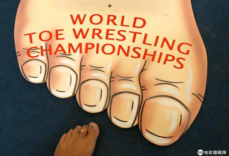 來到英國某處,人們正圍觀著兩名席地而坐的參賽者,只見兩人光著腳丫的指頭交纏在一起、腳的兩側則分別放置了擋板,而只要率先讓對手的腳掌碰到擋板的人就贏了——這裡正在舉行的就是「掰腳趾世界衛冕賽」。