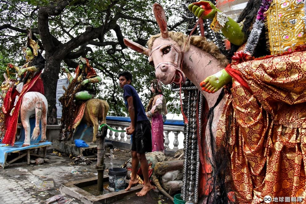 在西孟加拉邦負責管轄的霍拉市(Howrah),剛剛泡完恆河水的印度神祇一字排開,圍著中間打水的男子。