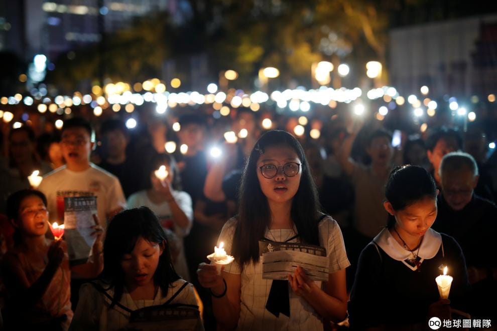 在維多利亞公園,成千上萬人手舉蠟燭參加六四天安門三十周年守夜活動,悼念為了爭取自由民主而犧牲的生命。