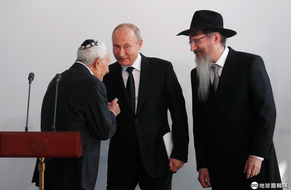 在莫斯科的猶太博物館和包容中心,俄國總統普亭(Vladimir Putin)和俄國首席拉比拉札(Berel Lazar,圖右)以及退伍軍人別爾斯基(Aron Bielski,圖左)一起為紀念碑揭幕,這座紀念碑是為了紀念二戰時在集中營裡頭抵抗的英雄而設。