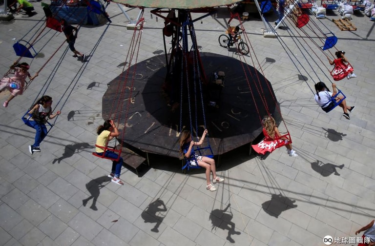 在開齋節(Eid al-Fitr)這一天,孩子們開心地玩著遊樂設施慶祝。