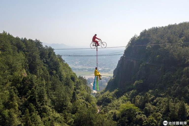在位於湖南省平江縣的石牛寨旅遊區,兩名男子正在表演高空騎單車的平衡特技。