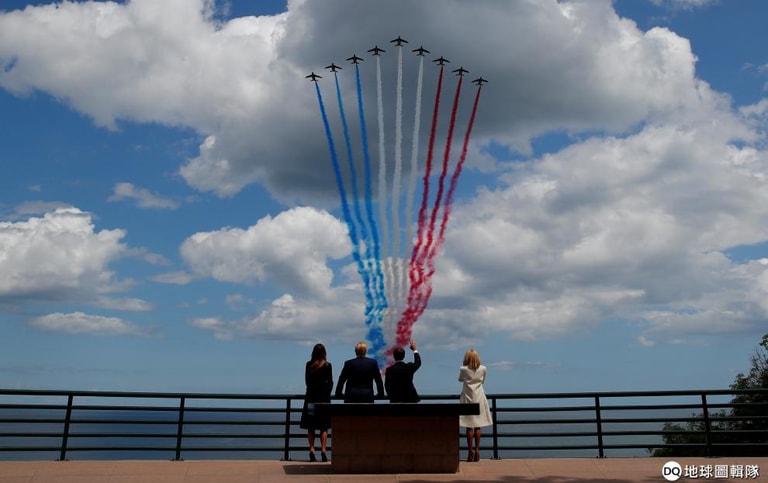 在諾曼第美軍墓園中,美國總統川普(Donald Trump,)、第一夫人梅蘭妮亞(Melania Trump)、法國總統馬克宏(Emmanuel Macron)和妻子布莉姬(Brigitte Macron)看向飛上藍天、尾翼拉出藍白紅煙的戰鬥機,紀念 75年前在這裡發生的諾曼第戰役。