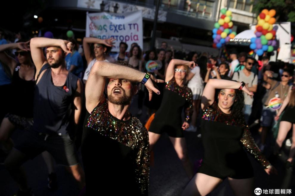 適逢每年 6月為LGBTQ驕傲月,世界各國都能看到同志大遊行。畫面為雅典街頭,以舞蹈參與遊行的人們。