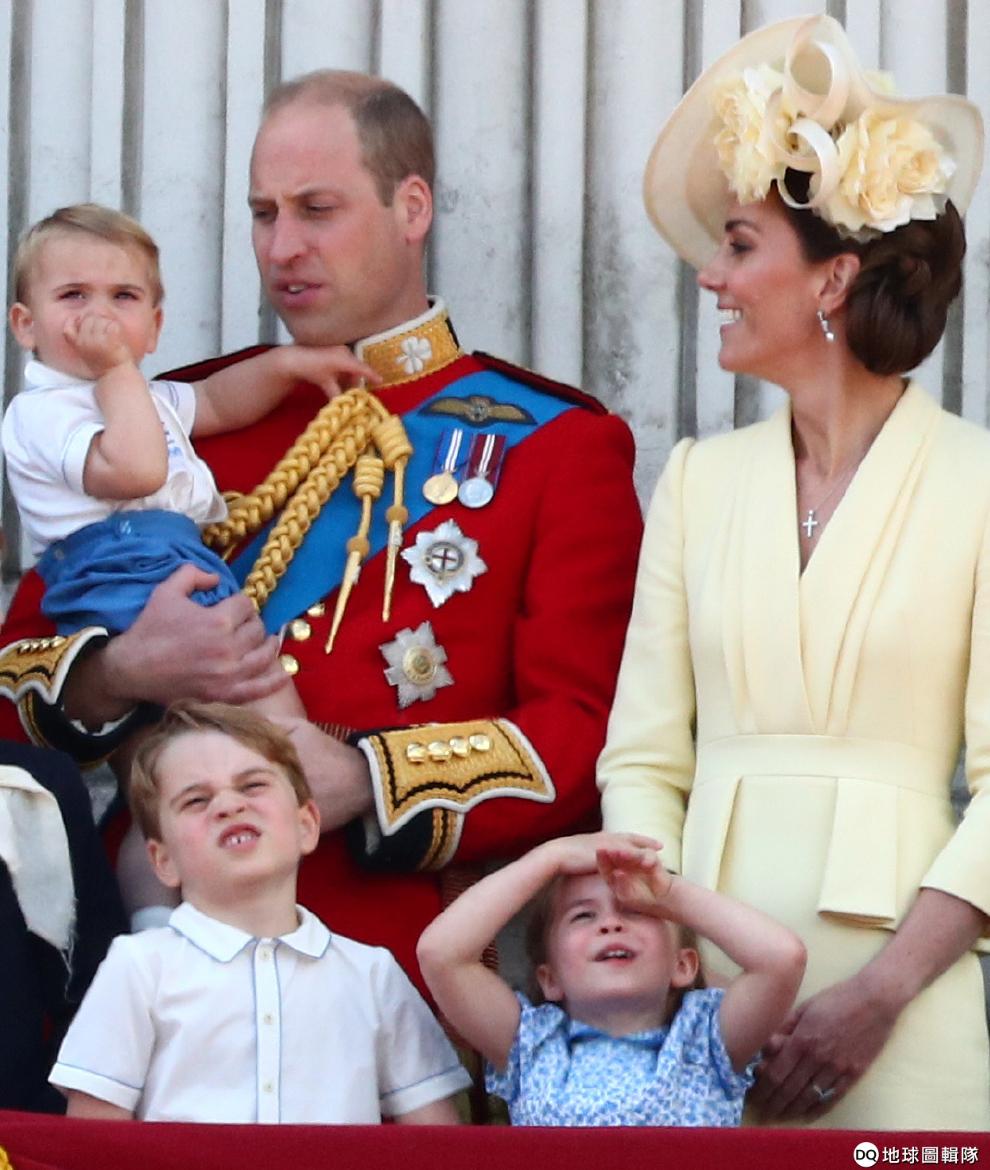 按照往例,英國皇室成員也會站在皇家陽台上一同觀賞閱兵儀式,而在今年,英國小王子喬治(Prince George of Cambridge,左下穿白襯衫者)生動的表情全被攝影師收進鏡頭裡。