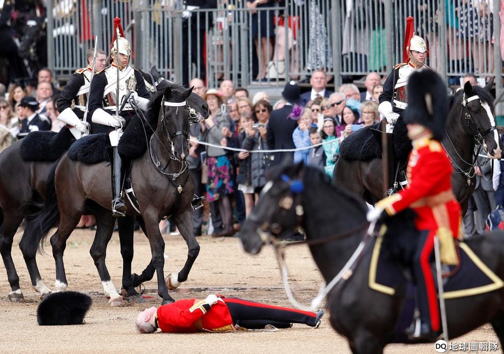 在一年一度的「皇家軍隊閱兵儀式」(Trooping the Colour),一名意外落馬的衛兵狼狽地躺在地上,就連帽子也飛了。