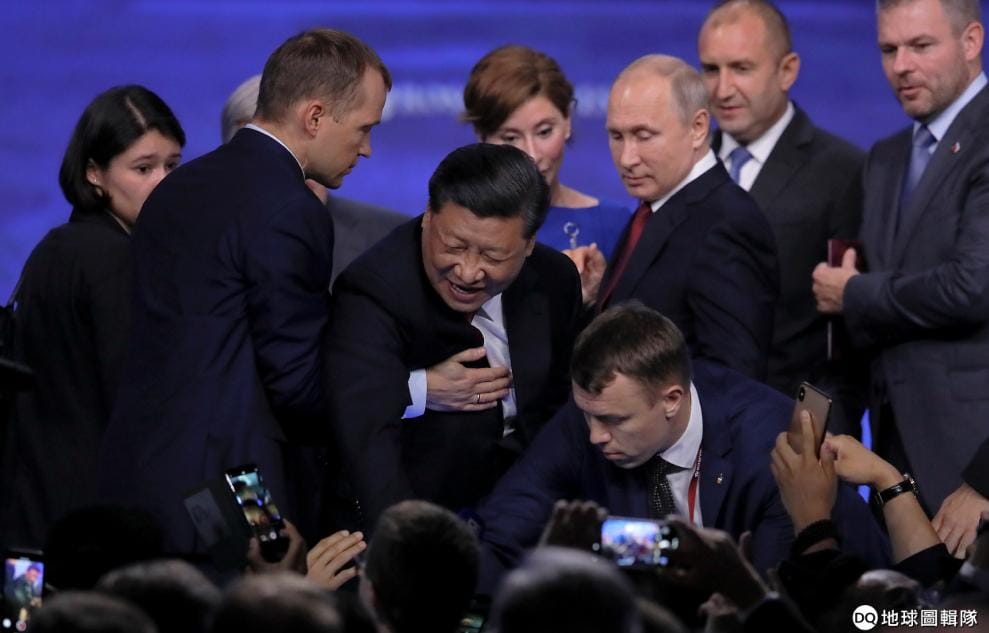 在聖彼得堡國際經濟論壇上(St. Petersburg International Economic Forum, SPIEF),中國領導人習近平彎身和與會者打招呼,俄國總統普亭(Vladimir Putin,右三)、保加利亞總統雷得夫(Rumen Radev,右二)、斯洛伐克總理佩萊格里尼(Peter Pellegrini,右一)則站在一旁看著。