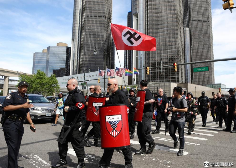 在城市底特律(detroit)舉辦著LGBTQ驕傲遊行的另一端,白人民族主義團體的成員走上街頭對此表達不滿。