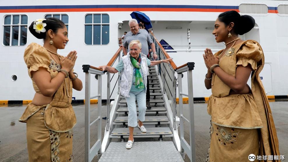 從遊輪MS Europa 2下船的觀光客,正輪番接受兩名斯里蘭卡女性歡迎。
