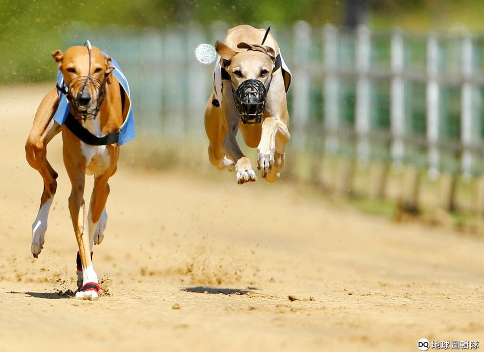 在一年一度的國際狗狗賽跑活動上,兩隻格雷伊獵犬正努力奔出好成績。