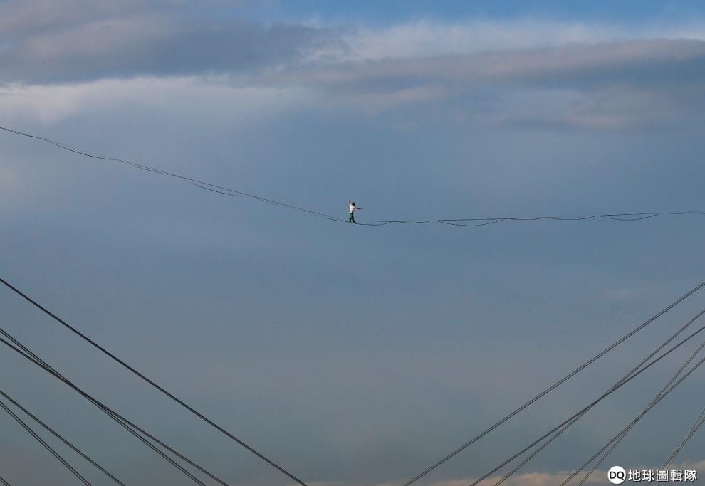 為了慶祝克拉斯諾亞爾斯克(Krasnoyarsk)的城市日,繩索好手凱根(Maksim Kagin)在維諾格拉多夫斯基吊橋(Vinogradovsky Bridge)之間的繩索上進行表演。