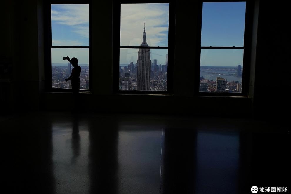 在位於紐約曼哈頓的觀景台石頭之巔(Top of the Rock),一名遊客正在和身後的帝國大廈自拍合影。