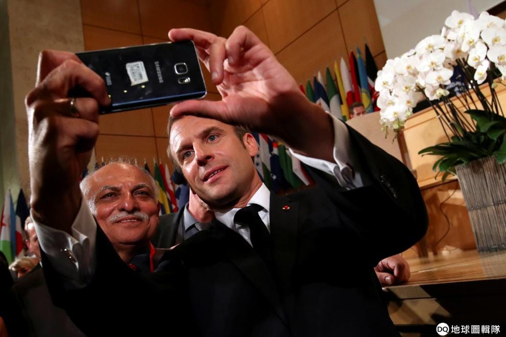 在國際勞工組織年會上,法國總統馬克宏(Emmanuel Macron)和與會者自拍著。
