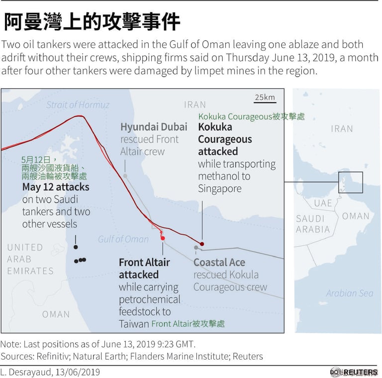 發生在阿曼灣的事故可說格外敏感。因為在今年 5月12日,沙烏地阿拉伯的富吉拉港口(Port of Fujairah)傳出 4艘船被不名人士攻擊、留下 1.5-3公尺不等的凹洞;同月 14號,則傳出有無人機撞上沙烏地阿拉伯兩處的油泵站。