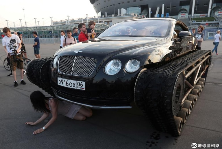 一名女子和裝上履帶的賓利Continental GT合照,這座由汽車愛好者打造的改裝車現正展示在聖彼得堡街頭。