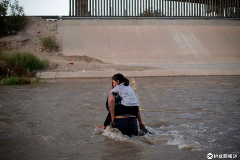 來自中美洲的移民涉過位於美國與墨西哥邊境的格蘭河(Rio Bravo),希望能在非法入境美國後,於德州的邊境城鎮厄爾巴索(El Paso)取得庇護。