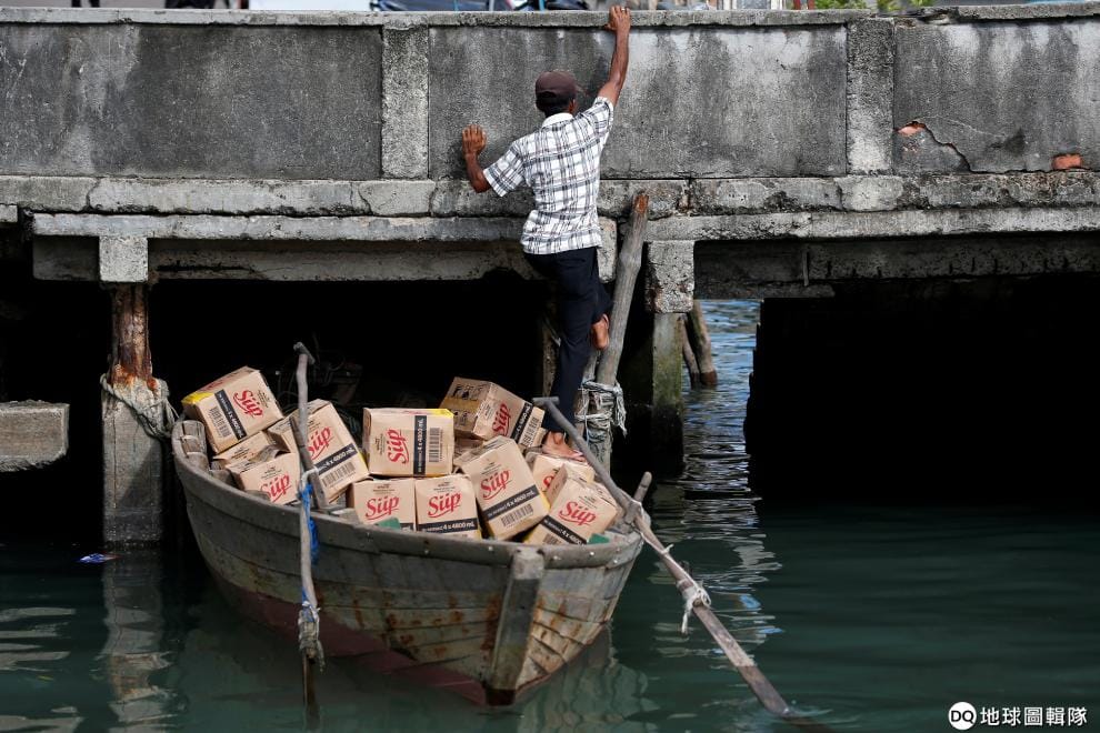 一名男子把成箱的貨物擺在木船後,準備離開這個位於民丹島的港口。