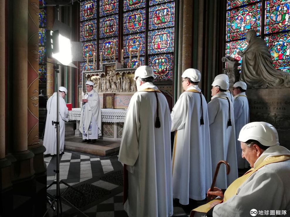 在巴黎總主教歐伯提(Michel Aupetit)的帶領下,人們正在兩個月前蒙受祝融之災的巴黎聖母院進行彌撒。