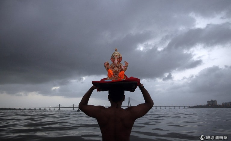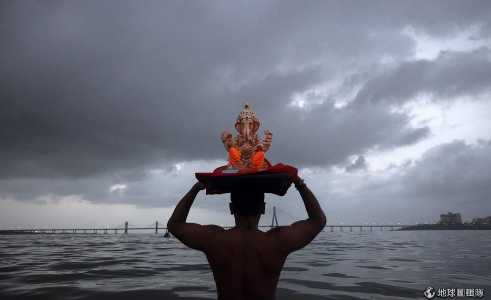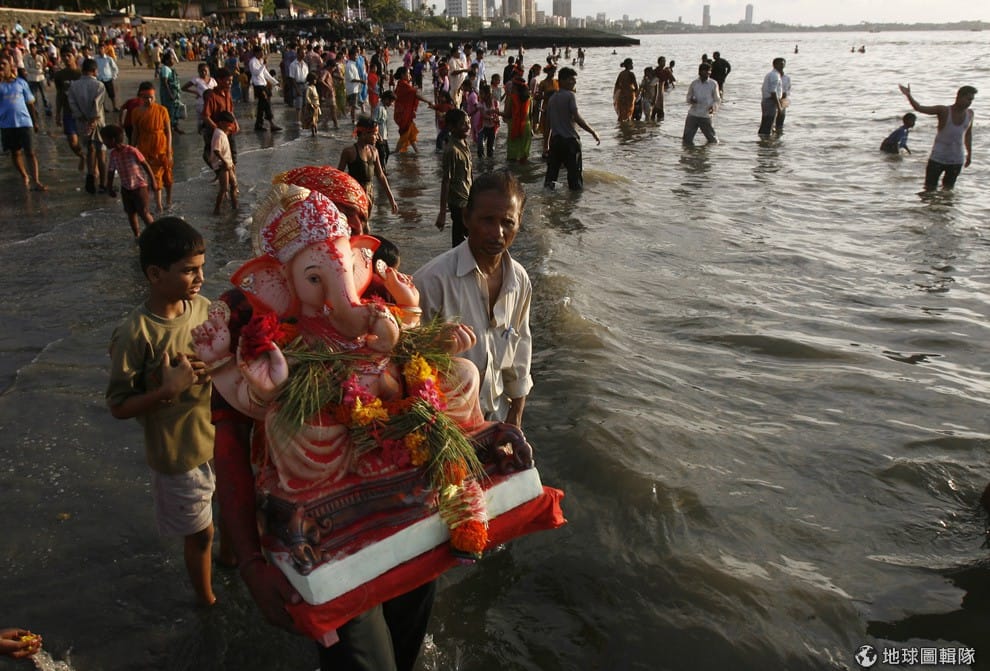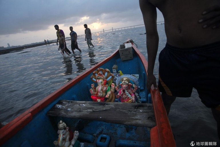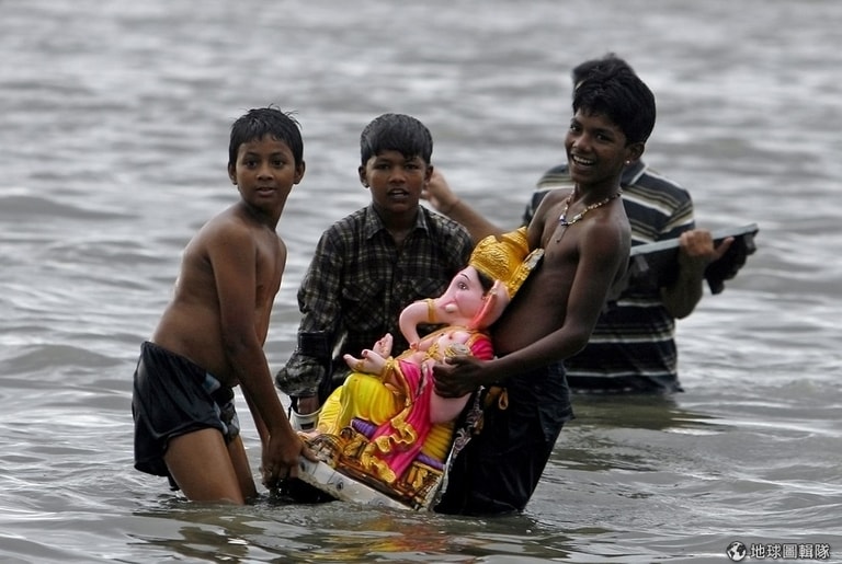印度家庭一起抬著巨大的象神雕像準備放到水裡。