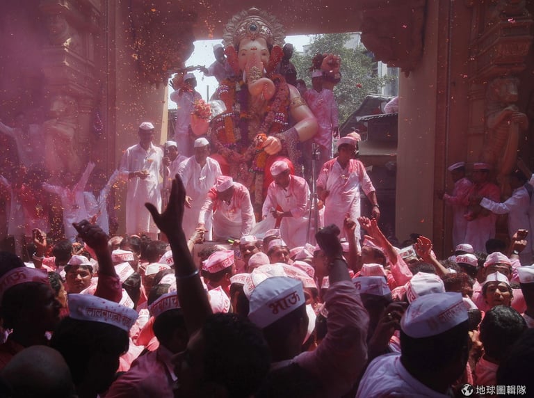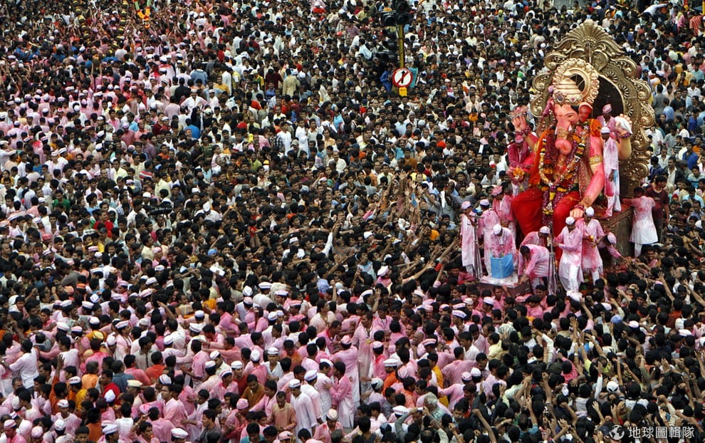 在家裡祭拜象神幾日之後,象神節的最後一天要讓象神回歸自然。印度人抬著象神雕像上街遊行,盡情地狂歡,每個人都沉浸的歡樂的氣氛中,一路浩浩蕩蕩地來到水邊。