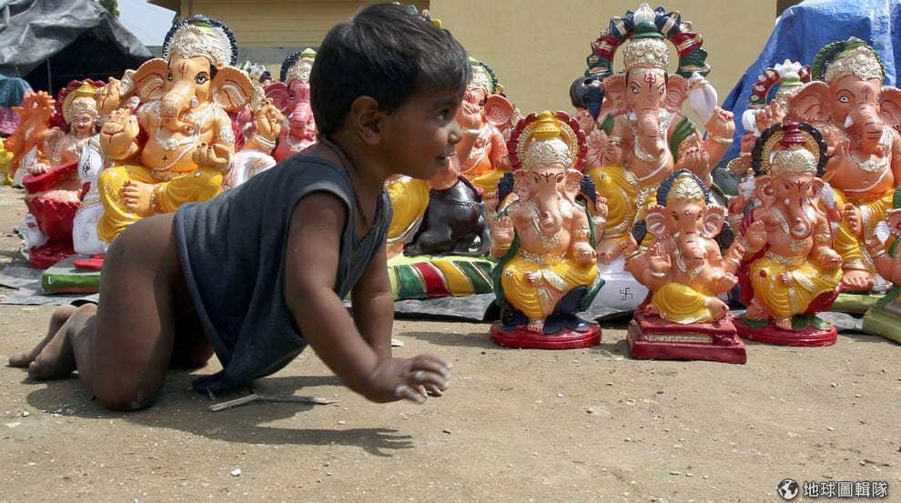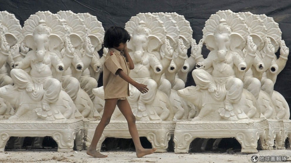 小朋友活力十足的在做好的雕像旁邊爬來爬去,一旁的象神雕像全都少了一隻象牙。傳說象神在抄寫史詩《摩訶婆羅多》的時候,是由廣博仙人口述,象神負責用筆抄寫。由於史詩太長,象神用來抄寫的神筆寫壞了,為了要趕上口述速度,象神折斷自己的象牙當筆繼續抄寫,所以現在圖畫中的象神才會少了一隻牙。