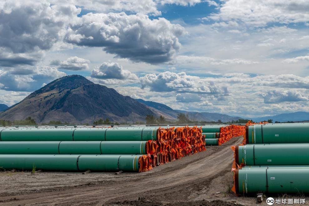 用於「跨山油管擴建計畫」(Trans Mountain Expansion Project)的鋼管被擺在一塊,等著政府批准這項 45億加幣(折台幣約 1,057億元)的計畫。
