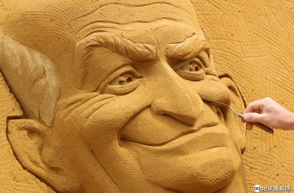 適逢沙雕藝術節,一名創作者正忙著用沙子刻出法國演員德菲內斯(Louis de Funes)的面孔。