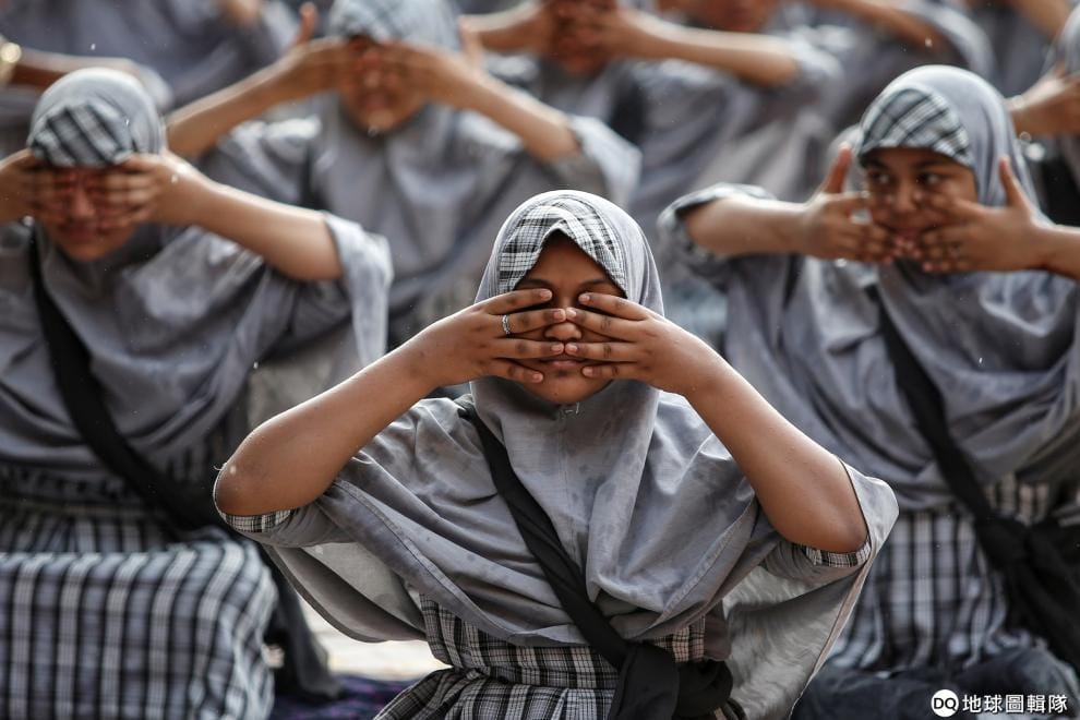 一群穆斯林學生正在瑜珈課伸展著四肢。他們將在本月 21號迎接國際瑜珈日。