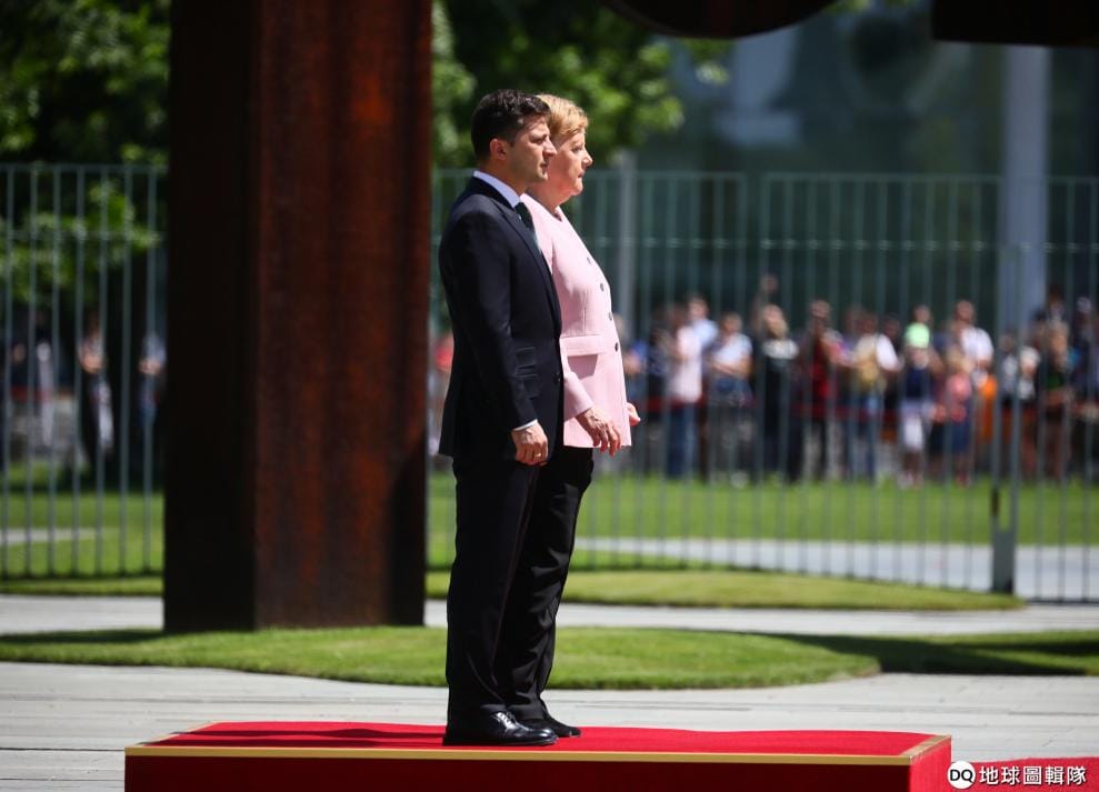 德國總理梅克爾(Angela Merkel)在德國總理府迎接烏克蘭總統澤倫斯基(Volodymyr Zelenskiy),兩人也一同在戶外聆聽軍樂隊演奏兩國國歌。