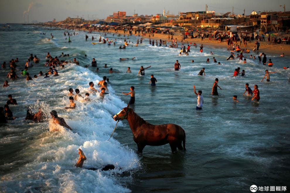 在一片徜徉在地中海消暑的人群中,一名男子也順便把他的馬牽到這裡洗澡。