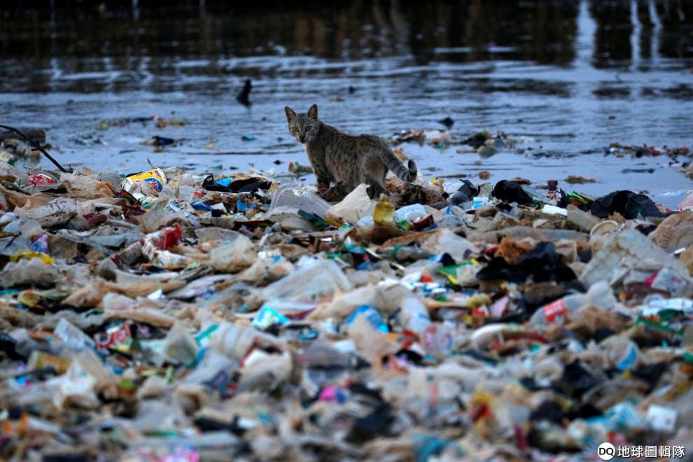 在充滿垃圾堆的海岸線上,一隻回眸的貓咪恰好被攝影師納進鏡頭中。