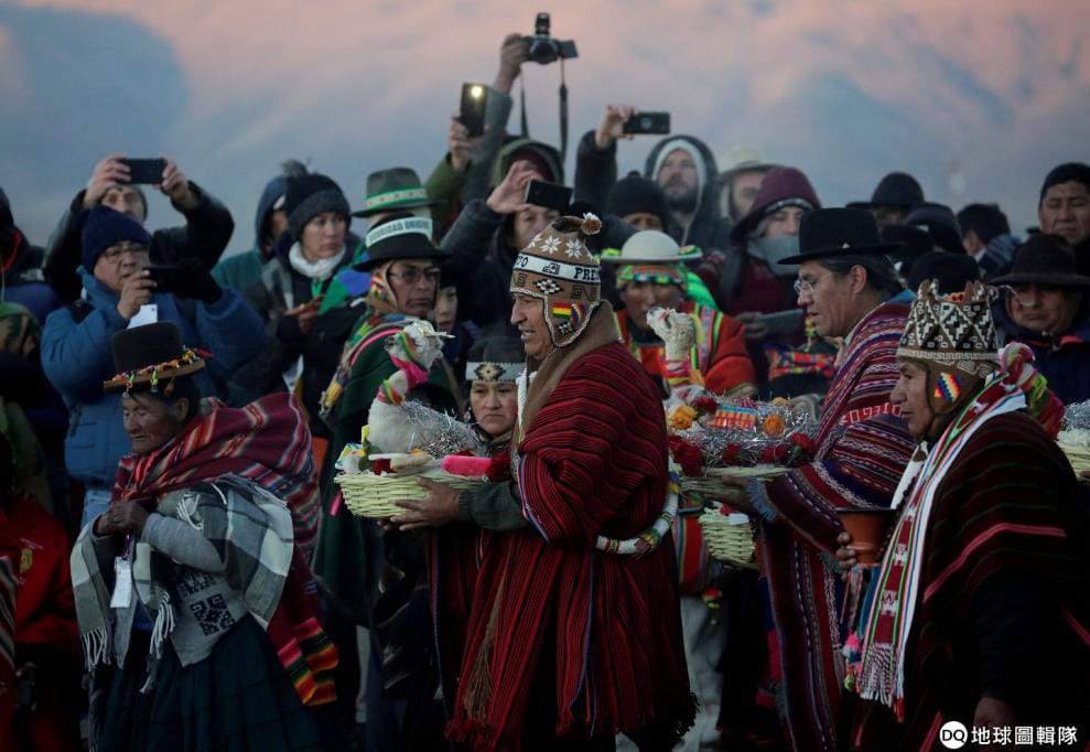對位於南半球的原住民艾馬拉人(Aymara)來說,這天既是冬至,也是他們的新年日。同為艾馬拉人的玻利維亞總統莫拉萊斯(Juan Evo Morales Ayma,畫面中間)也一同參與了慶祝儀式。