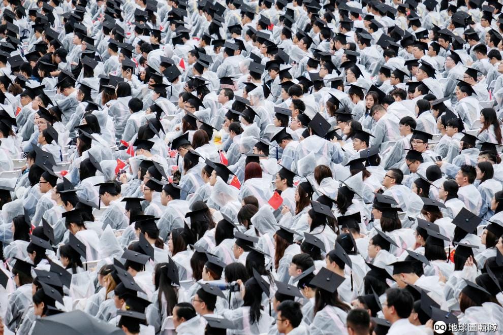 武漢大學畢業生們紛紛穿起雨衣,在風雨之中參與了畢業典禮。