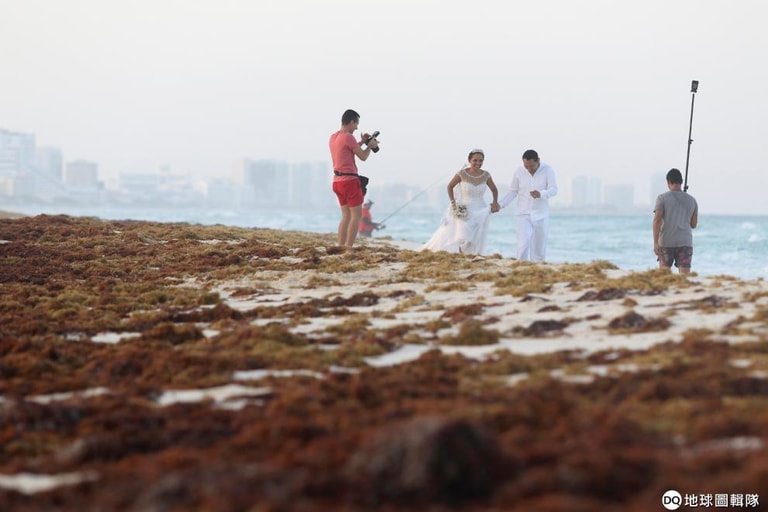 在充滿海草的坎昆(Cancun)沙灘上,一對新人正在拍婚紗照。