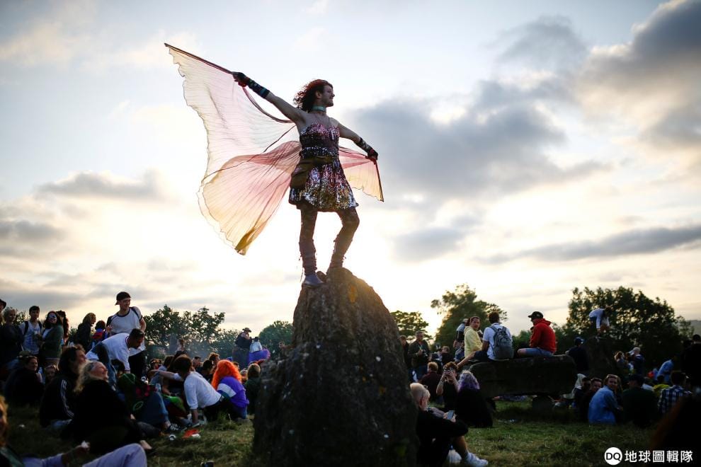 在舉辦格拉斯頓伯里音樂節(Glastonbury Festival)的薩默塞特郡(Somerset)沃西農場(Worthy farm),打扮成仙女的參加者站在石塊上展翅,享受美妙的音樂和夕陽美景。