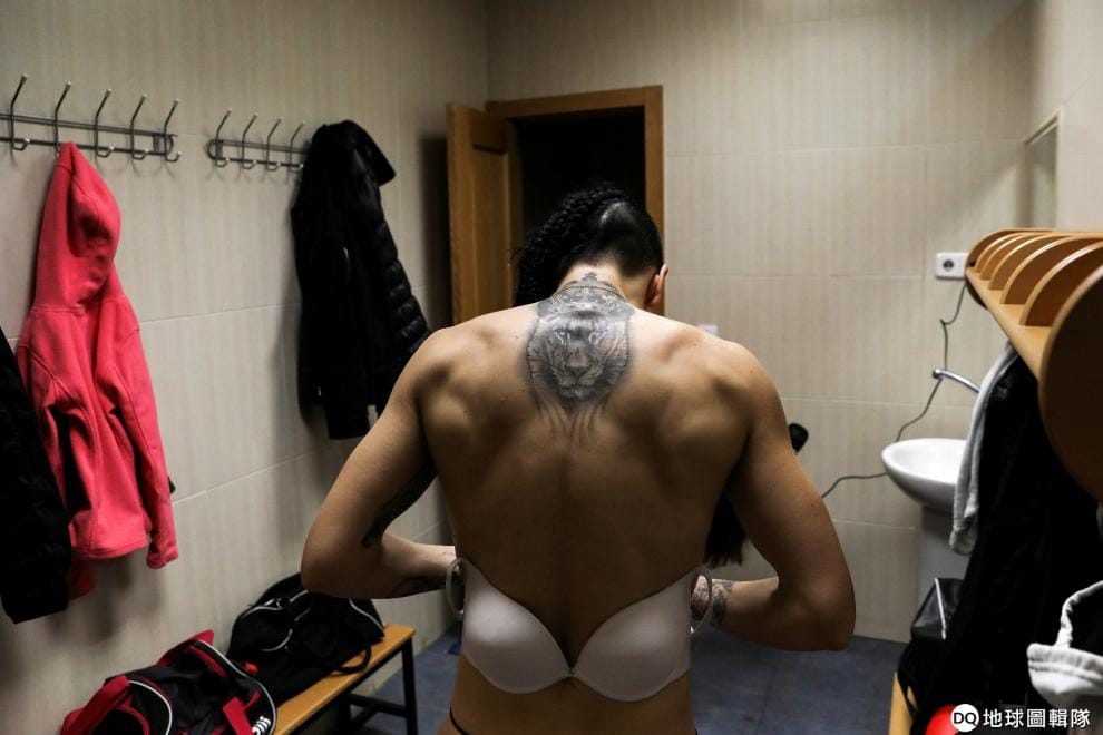 在西班牙馬德里一間體育館的休息室,練完拳的拳擊選手「皇后」(La Reina)古提亞蕾斯(Miriam Gutierrez)換下拳擊服。