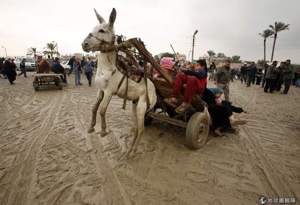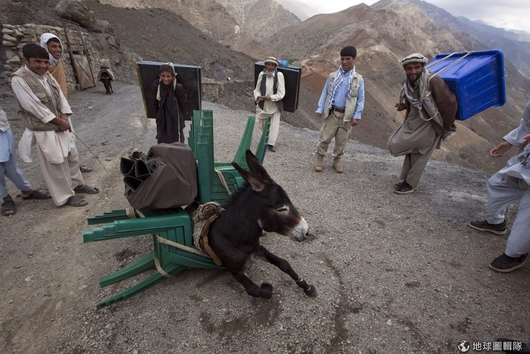 2010年阿富汗正值重要大選,照片中載送競選物資到村落的驢子累得站不起來。