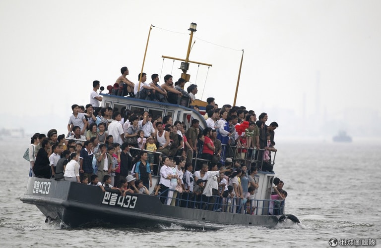 北韓的民眾擠在大船上往中國鴨綠江畔望去。