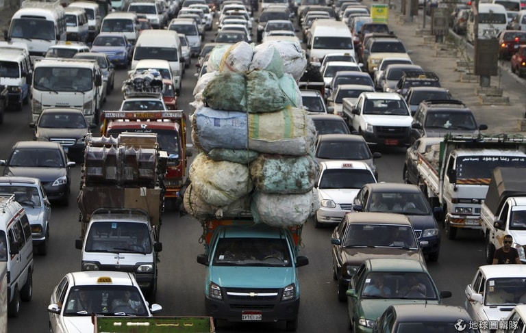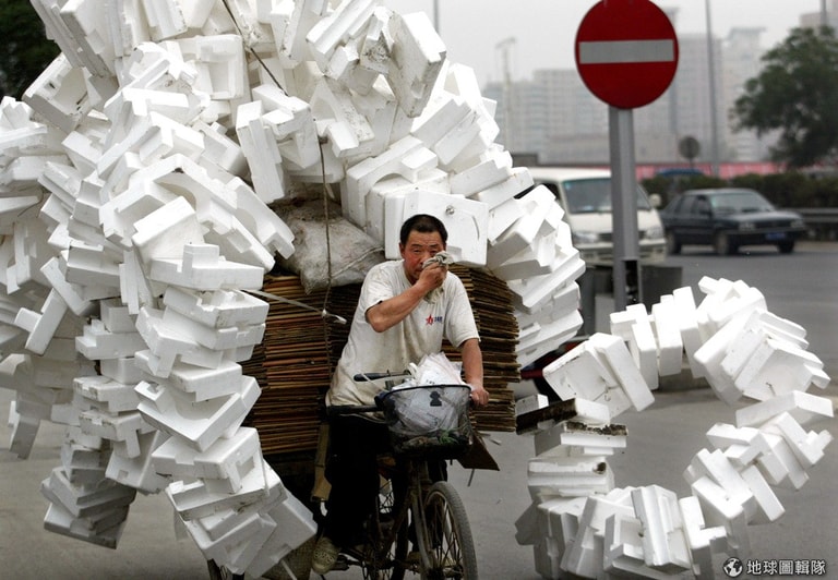 一名載著回收物的男子騎著三輪車,後面的回收物已經超出車身能載的容量,多出的貨物只好用繩子綁綁,反倒成了驚人的奇觀。