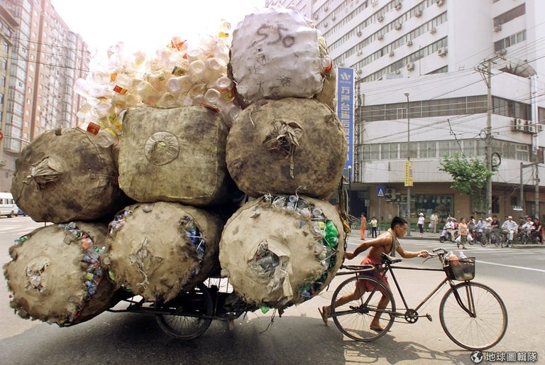 上海街頭的一輛腳踏車上,載著滿滿的塑膠瓶罐和塑膠袋,綑在一塊的景象讓腳踏車和騎士顯得嬌小許多。