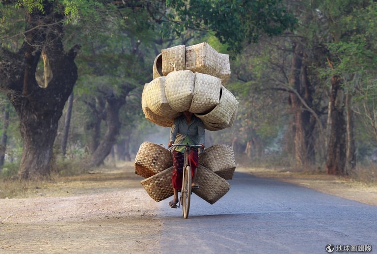 一名專在市場賣竹籃維生的婦女,把生財的籃子全堆在身上,緩緩騎著腳踏車做生意去。