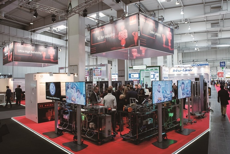 每年4月舉行的全球最大工業展漢諾威工業展(HANNOVER MESSE),今年首次設置5G展示區,現場展出的機器人和生產設備不再透過纜線,而是藉由無線高速網路互通訊息,讓人感受到無人智慧工廠的威力。