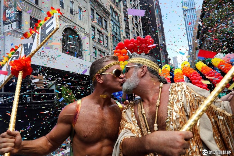 在紐約紀念石牆暴動(Stonewall riot)滿五十周年的LGBTQ大遊行上,參加者開心親吻紀念這一刻。