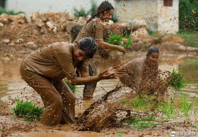 在盛產稻米的尼泊爾中部,參加全國稻田日(National Paddy Day,Asar Pandra)的民眾一邊插秧,一邊打泥巴仗,用滿滿的笑聲迎接即將到來的雨季。