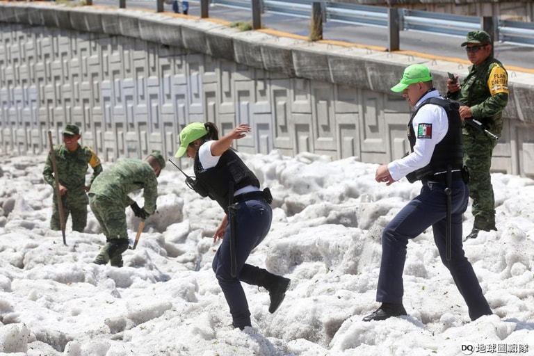 在墨西哥第二大城瓜達拉哈拉(Guadalajara),軍人和維安人員忙著清除冰雹暴雨帶來的災情。