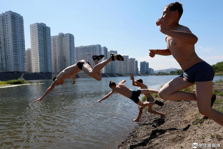 在靠近葉尼塞河(Yenisei River)河岸的克拉斯諾亞爾斯克市(Krasnoyarsk),男孩們在遭逢熱浪襲擊的當地跳入葉尼塞河中消暑。