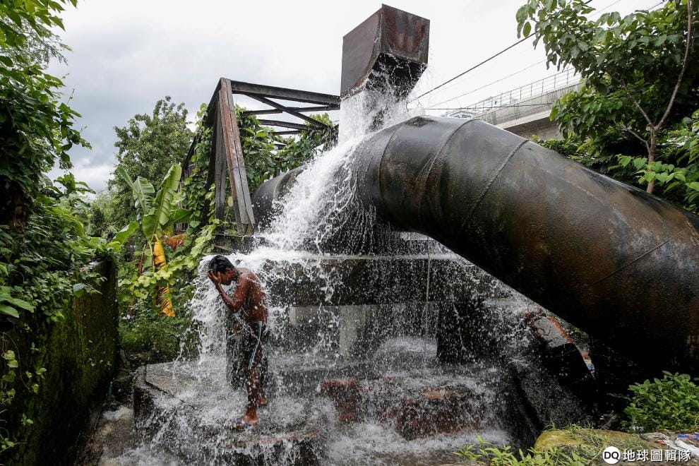 在加爾各答的貧民窟,一名男子在破裂的飲用水道下沖涼消暑。