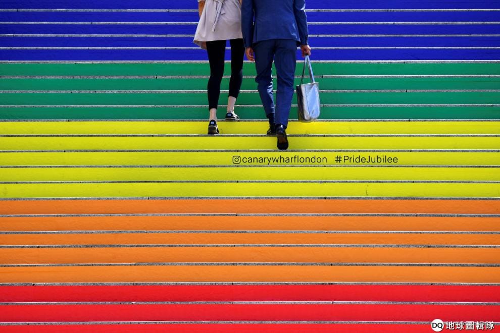 在倫敦金絲雀碼頭(Canary Wharf ),一對情侶走上剛剛裝修好的彩虹台階。