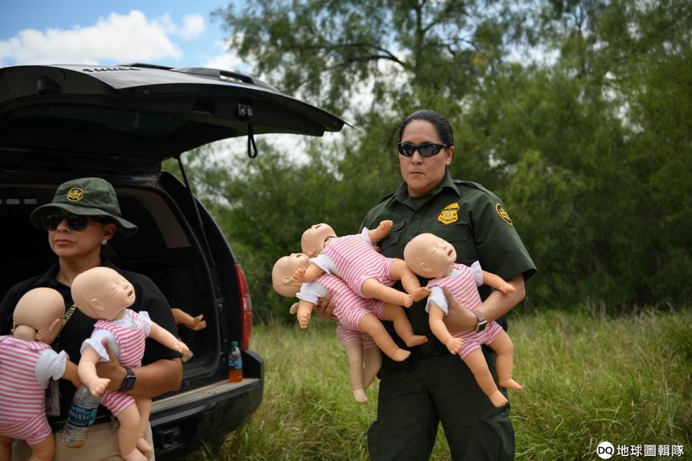 在美墨邊界的德州米申市(Mission),美國邊境巡邏隊員手抱著娃娃,準備參加「邊境安全倡議」(Border Safety Initiative)媒體活動。