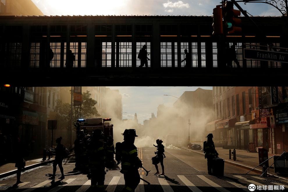 在紐約市的布魯克林區,地上的人孔蓋冒火,消防隊員趕緊到現場搶救。與此同時,民眾則透過天橋穿越馬路。